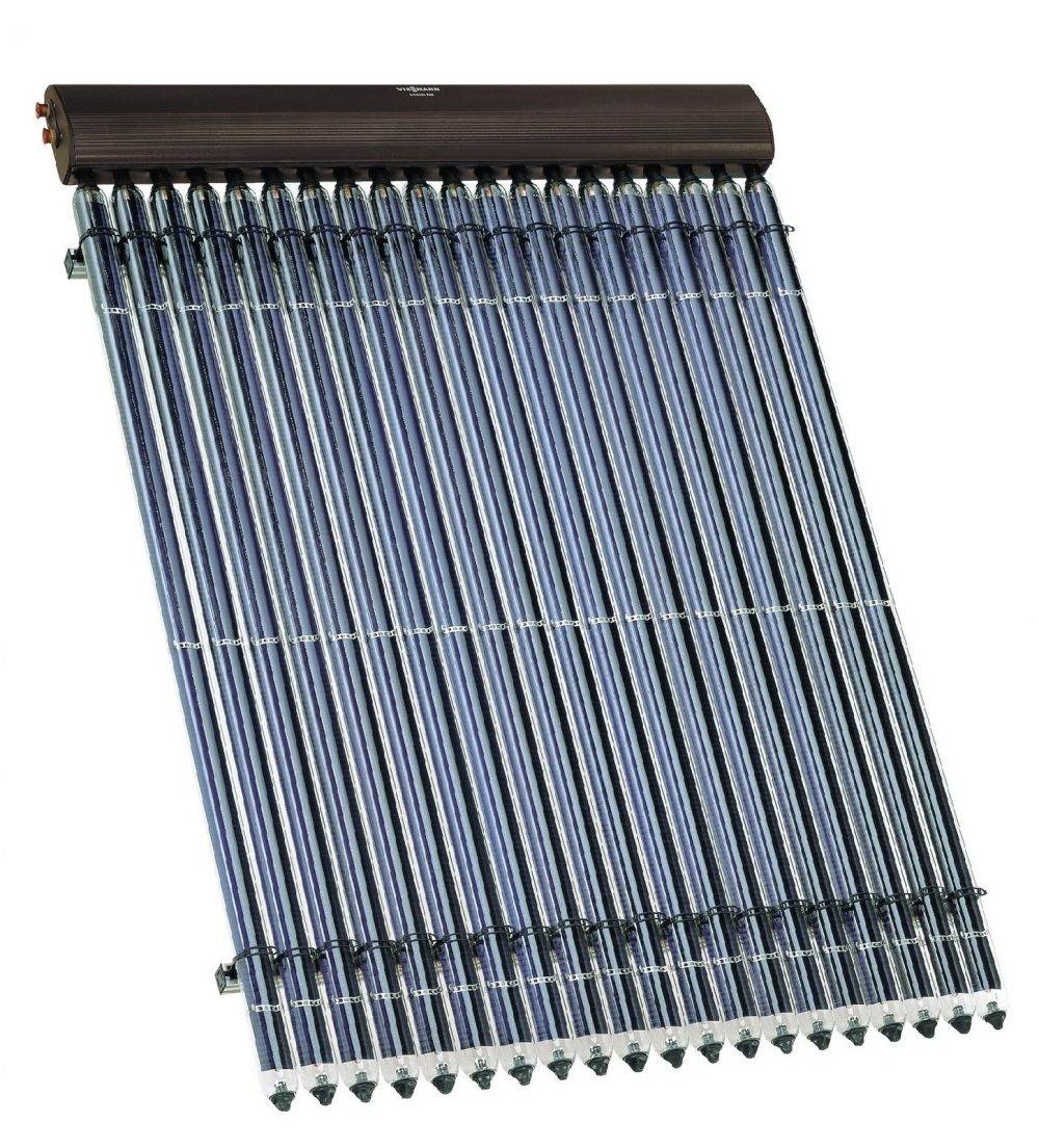 Дорогостоящий вид солнечного коллектора вследствие сложного изготовления и ряда преимуществ перед плоскими солнечными панелями. Конструктивно представляет собой ряд парных стеклянных труб, спаянных между собой, из пространства между которыми откачан воздух. Вакуум в пространстве между трубками является прекрасным тепловым изолятором и предотвращает тепловые потери в окружающую среду от теплоносителя. В меньшую трубу вводится медная, алюминиевая или стеклянная трубка поглотителя. Трубы верхней частью вводятся в распределитель, в котором циркулирует теплоноситель. Вакуумные (вакуумированные) трубчатые коллекторы по типу распределителя подразделяются на два типа: с плоской тепловой трубой и прямоточные.