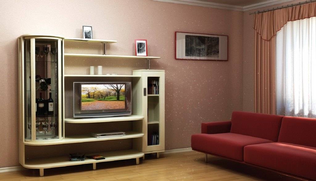 Угловые стенки ставят в гостиные маленького размера. В углу обычно устанавливают шкаф, сервант или бар, но встречаются модели где в углу располагают телевизор. Такие модели выглядят миниатюрно, занимают мало места.