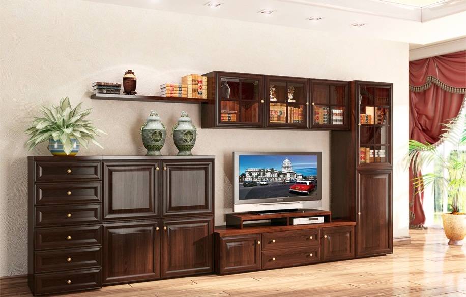 Современные атрибуты отличаются изысканностью и шармом, в них должна присутствовать некая старина, которую дизайнеры намеренно создают. Для такого стиля подойдут красивые изделия из дорогих, желательно натуральных материалов с качественной отделкой. Часто классические модели отличаются не только роскошью, но и габаритностью, поэтому вряд ли гармонично впишутся в маленькую комнату. Вот некоторые примеры классических стенок: