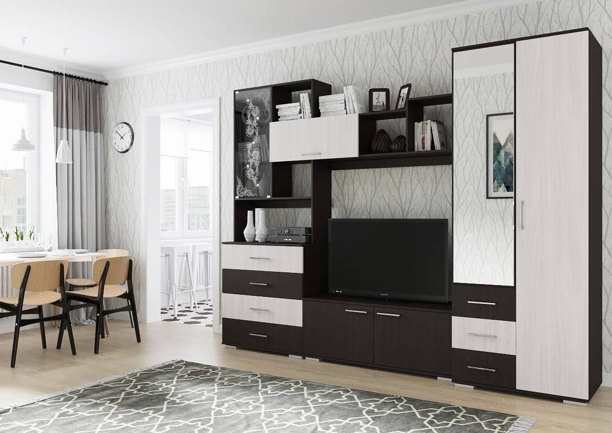 У стенки в гостевом зале может быть не только различная комплектация, но расположение в зависимости от условий.