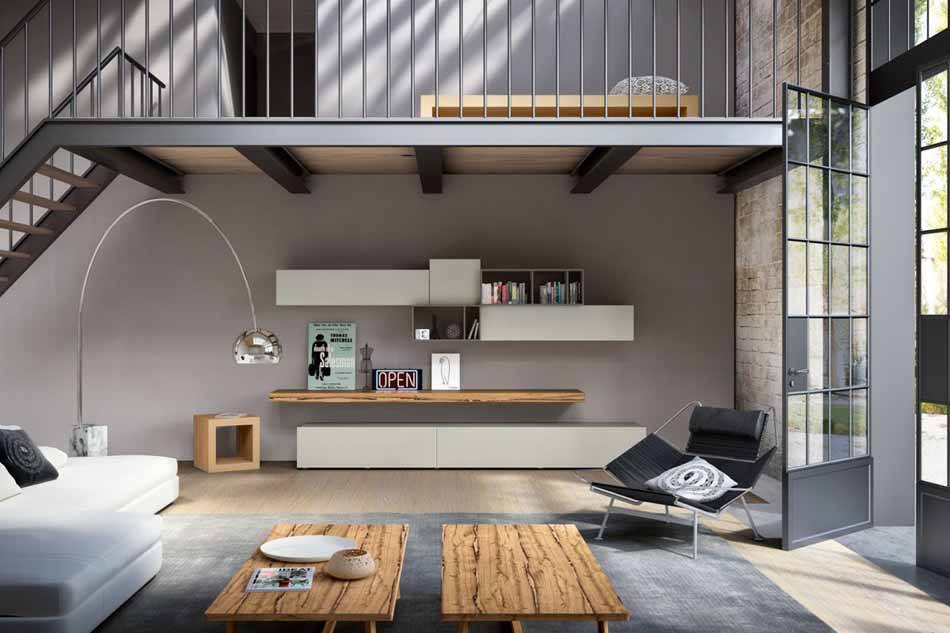 На фото интерьер гостиной в стиле лофт, оформленный открытым шкафом желтого оттенка.