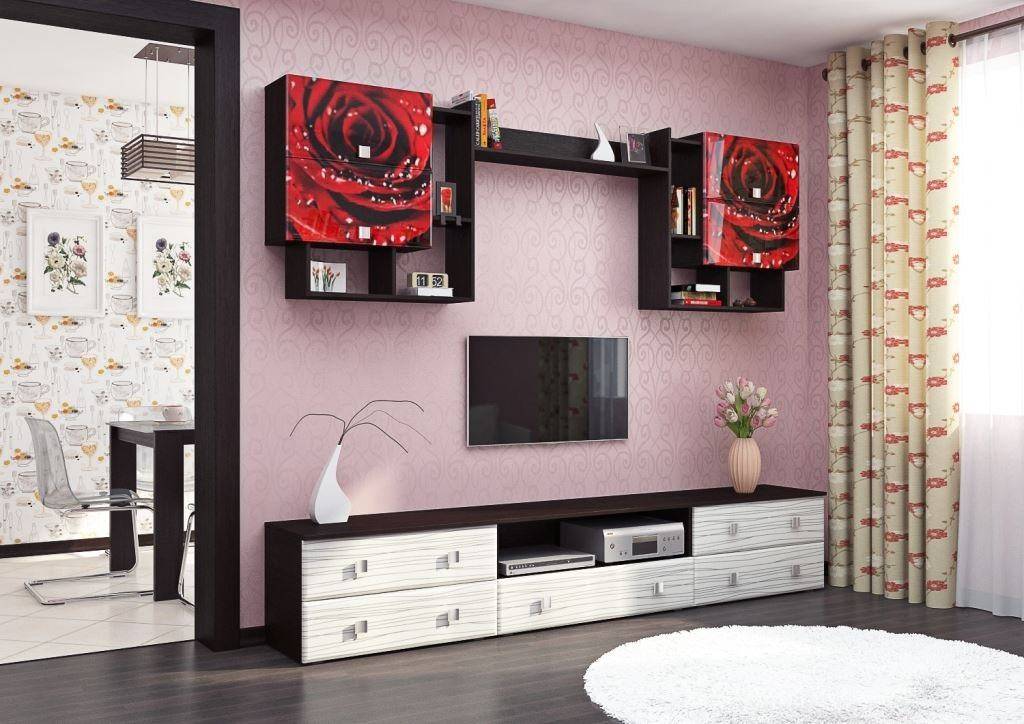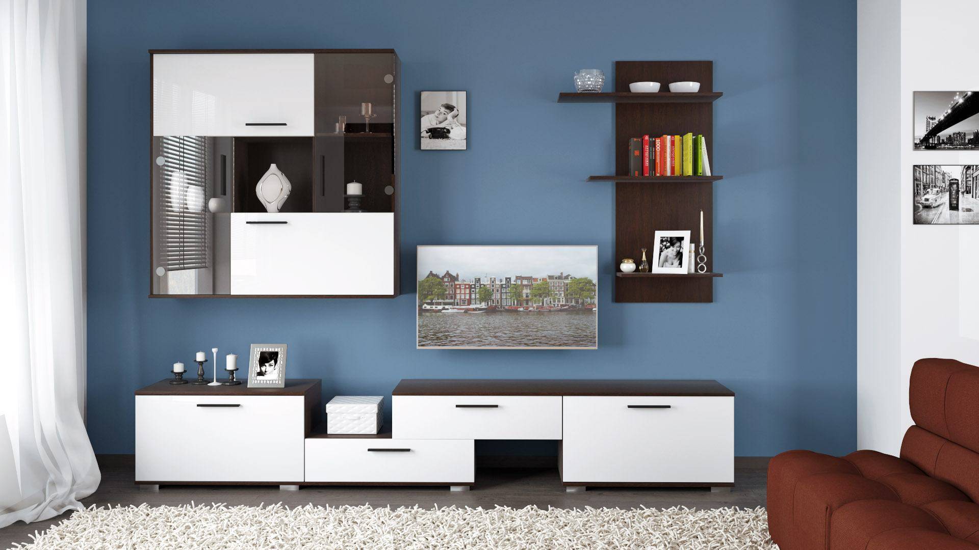 Этот вариант, который представлен на, подходит для малогабаритных квартир типа студия или с одной комнатой. Мини-стенки имеют небольшую комплектацию: ТВ-тумба, открытые полочки, небольшой навесной шкаф. Некоторые композиции могут состоять из подвесной полки и нижней тумбы под технику. Модульные мини-стенки, как правило, имеют небольшие размеры, лаконичный дизайн и считаются эконом вариантом для небольшой по площади гостиной комнаты.