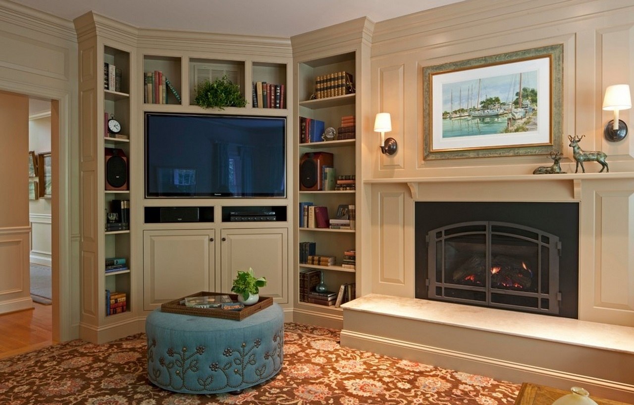 Вариант для не слишком больших помещений. Зачастую устанавливается в комплектации со шкафом или тумбой с телевизором , но используют другие варианты расположения мебели в углу. Выбирая угловой формат, вы получите много свободного места для установки гостиной мебели вроде дивана обеденного стола или журнального столика со стульями.