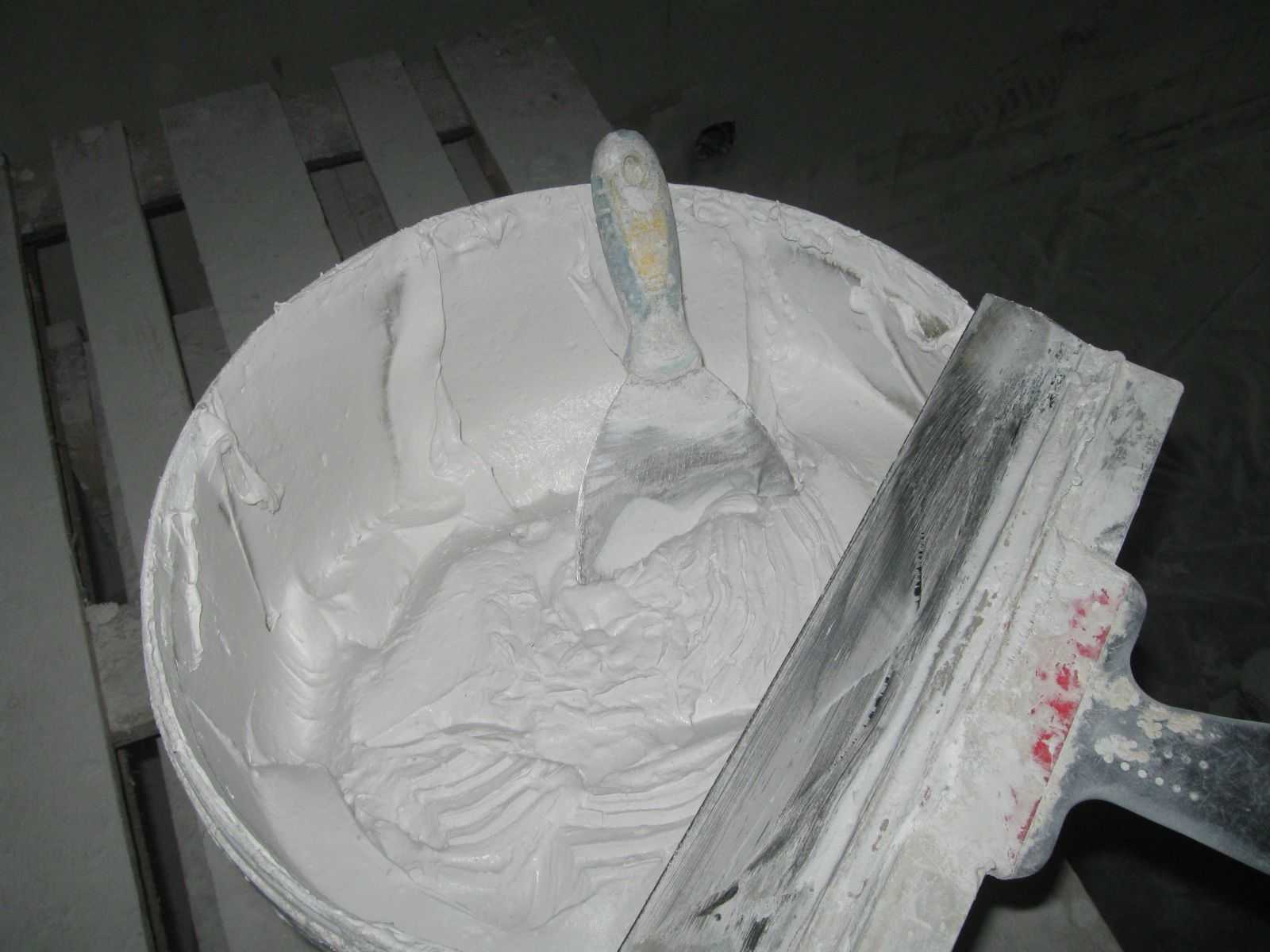 Бетонные и штукатуренные потолки и стены перед их окрашиванием или наклейкой обоев шпаклюются замазкой на основе гипса. Это не совсем удобно — гипс быстро схватывается. Поэтому его приходится замешивать маленькими порциями.