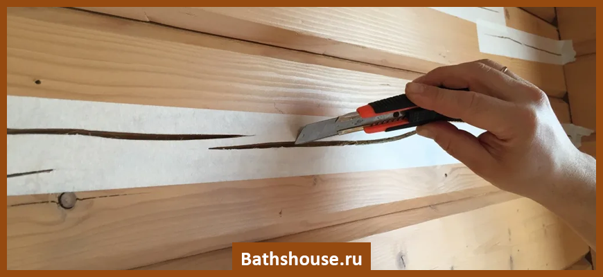 - края глубоких трещин обклейте малярной лентой во избежание попадания герметика на поверхность бревна;