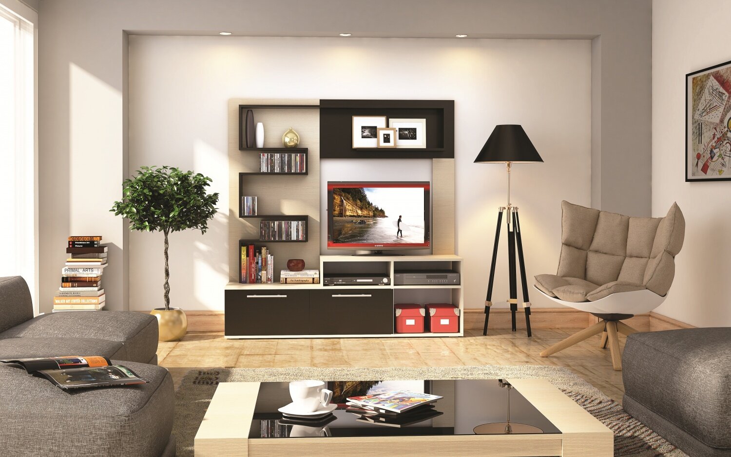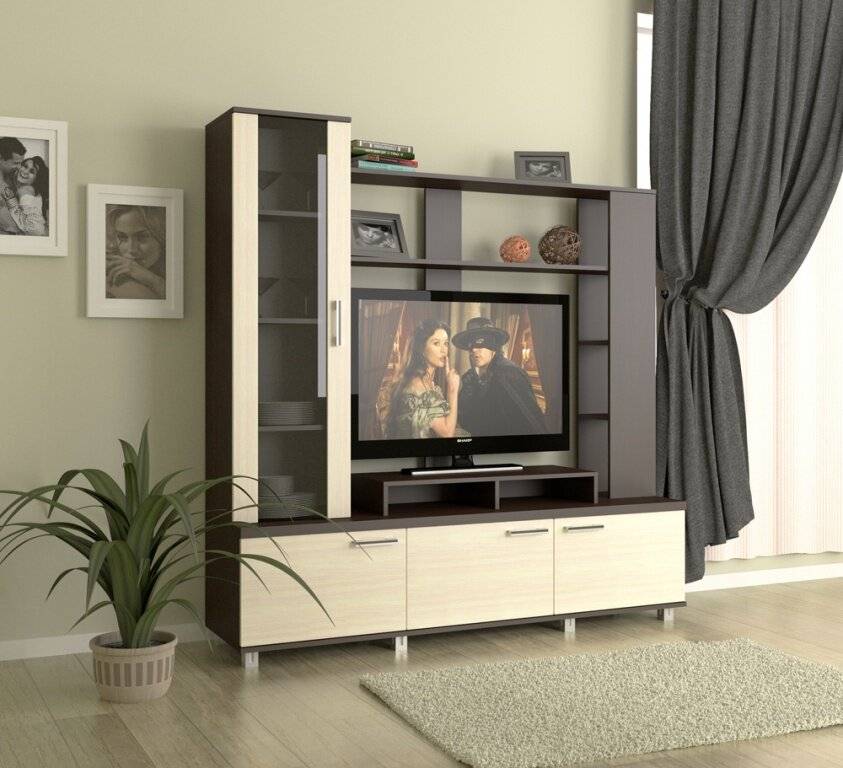 Этот вариант, который представлен на, подходит для малогабаритных квартир типа студия или с одной комнатой. Мини-стенки имеют небольшую комплектацию: ТВ-тумба, открытые полочки, небольшой навесной шкаф. Некоторые композиции могут состоять из подвесной полки и нижней тумбы под технику. Модульные мини-стенки, как правило, имеют небольшие размеры, лаконичный дизайн и считаются эконом вариантом для небольшой по площади гостиной комнаты.