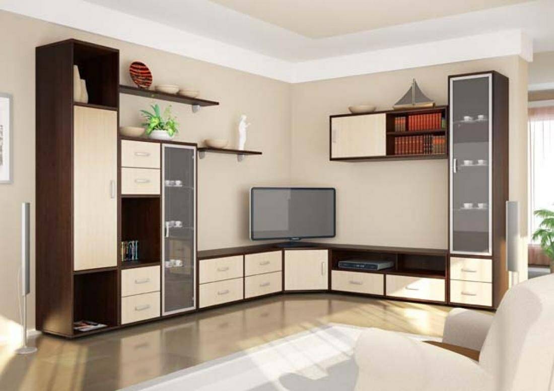 - узкие помещения требуют угловых вариантов стенок, состоящих из нескольких секций, которые можно разместить в разных частях гостиной;