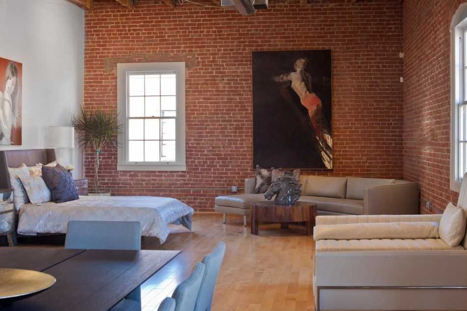 Собственно отделка под кирпичную кладку одной из стен уже является мощным идентификатором стиля. Если его дополнить большим шкафом-купе с зеркальными створками и правильно расположить, то визуально пространство станет еще больше. Оно также расширится, если использовать для отделки стен белую штукатурку.