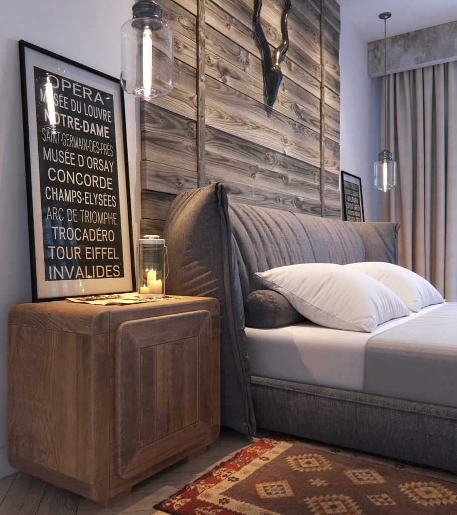 Оригинальным украшением данной стилистики может служить деревянный ящик вместо прикроватной тумбочки. Красиво смотрятся большие бархатные подушки, гирлянда из светодиодных ламп или замысловатой формы светильник на потолке или на стене.