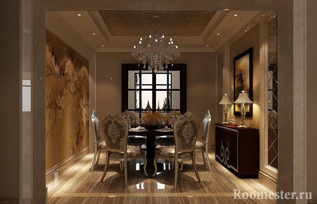 Обычно кухонное расположение выглядит так: в центре комнаты — обеденная зона, над ней — массивная люстра, все остальные предметы обстановки располагаются вокруг (опять же, подчиняясь законам симметрии). Стол может быть как прямоугольным, так и круглым. Главное, чтобы это была строгая геометрическая форма.