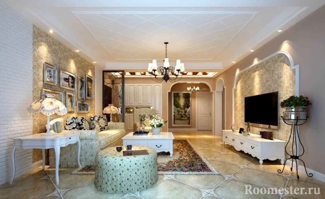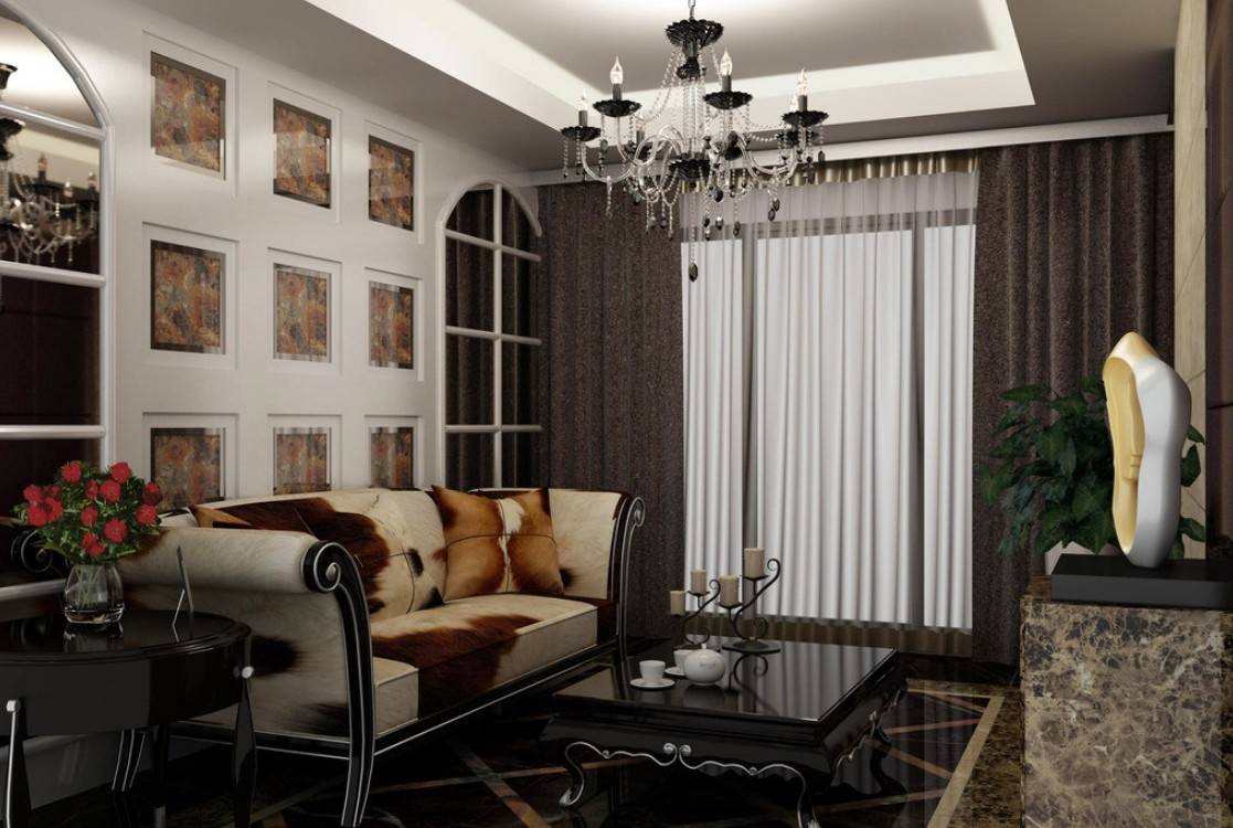 Украсить стены в гостиной позволит декор в виде зеркал, барельефов, статуэток или ваз. Покрытие пола выполняется, как в однотонном варианте, так и дополняется орнаментами или рисунками в центре. Подчеркнуть оконные рамы можно переплетами или витражами.