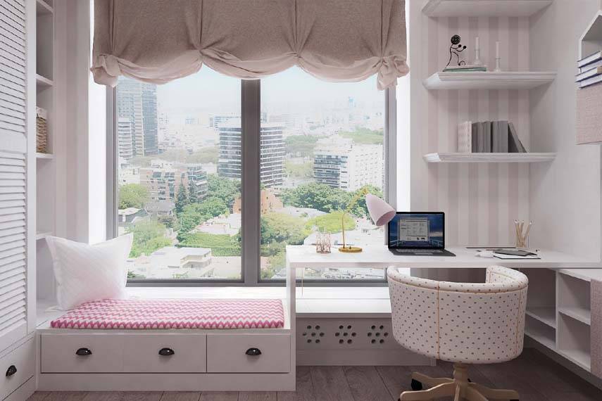 Размеры и форма письменных столов на подоконнике меняются в зависимости от назначения комнаты. Модели, расположенные на небольшом расстоянии от стены, с закругленными краями отлично подойдут для детской. По бокам можно разместить стеллажи для хранения вещей.