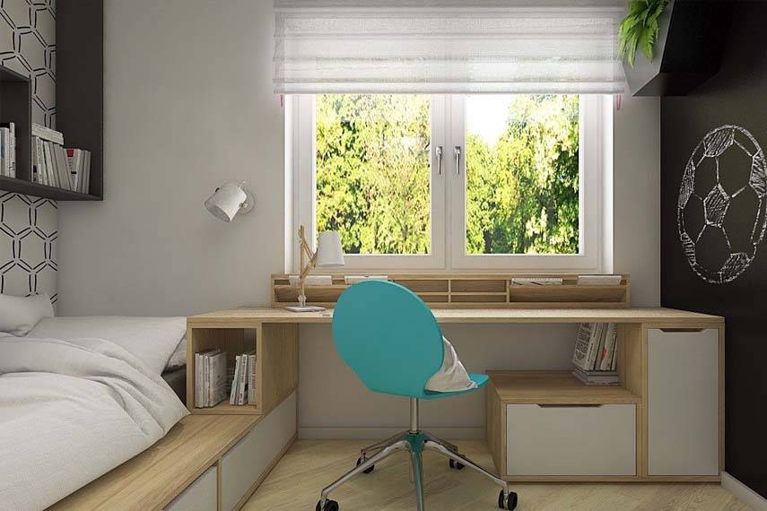 Форма письменного или компьютерного стола у окна во многом будет зависеть от стиля интерьера и увлечений ребёнка. Мальчикам больше по душе кантри, лофт, хай-тек и прочие современные стили. Отлично будут смотреться встроенные конструкции или модели-трансформеры. Мальчишкам требуется много полок и ящиков для моделей машин, книг, инструментов и различных мелочей.