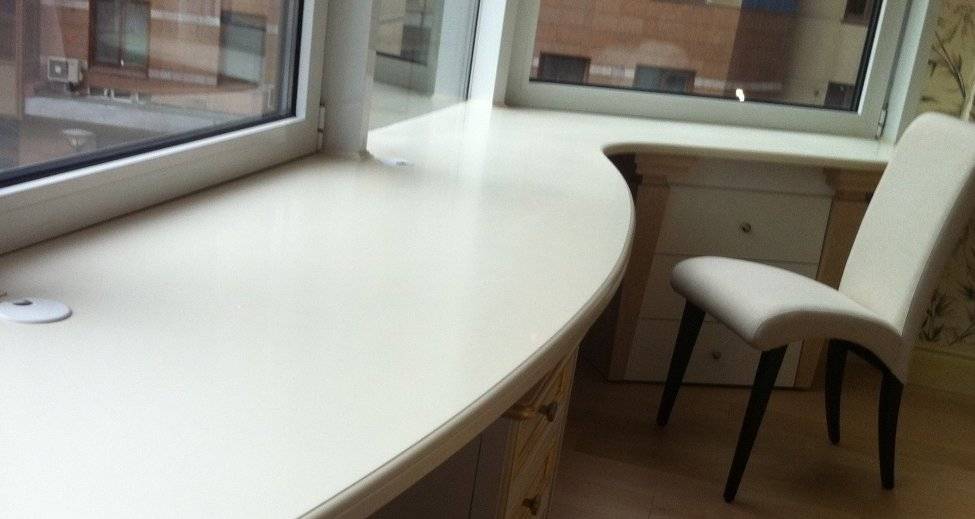 ПВХ-столешница более доступна о цене и отлично сочетается с пластиковым подоконником и белыми рамами