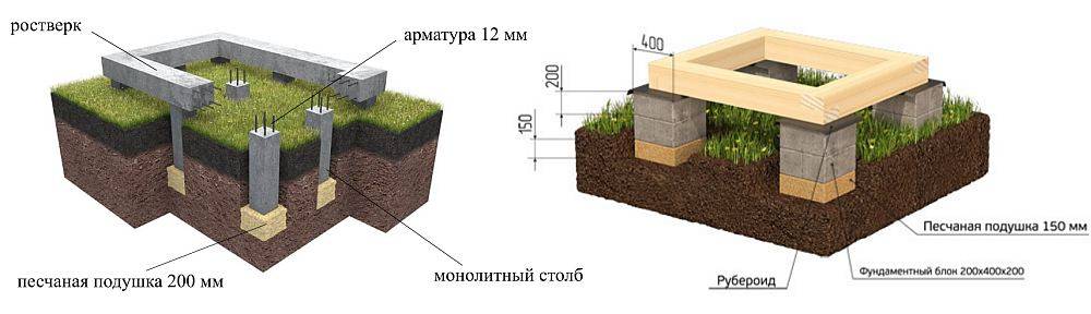 Напомним: легкие опоры с малым заглублением подходят для нетяжёлых конструкций на прочных грунтах. Столбики можно выставить под каркасный дом или хозяйственную постройку. Столбчатый фундамент для бани станет отличным эффективным и дешевым вариантом устройства несущего основания.