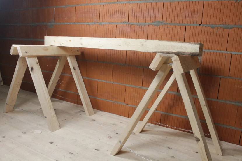 Длина «козла» зависит исключительно от размеров имеющихся материалов. Разумеется, слишком короткий стол будет очень неудобен, особенно на большой высоте. И нужно помнить о том, что на столе, возможно, будут стоять два человека и ведро с раствором.