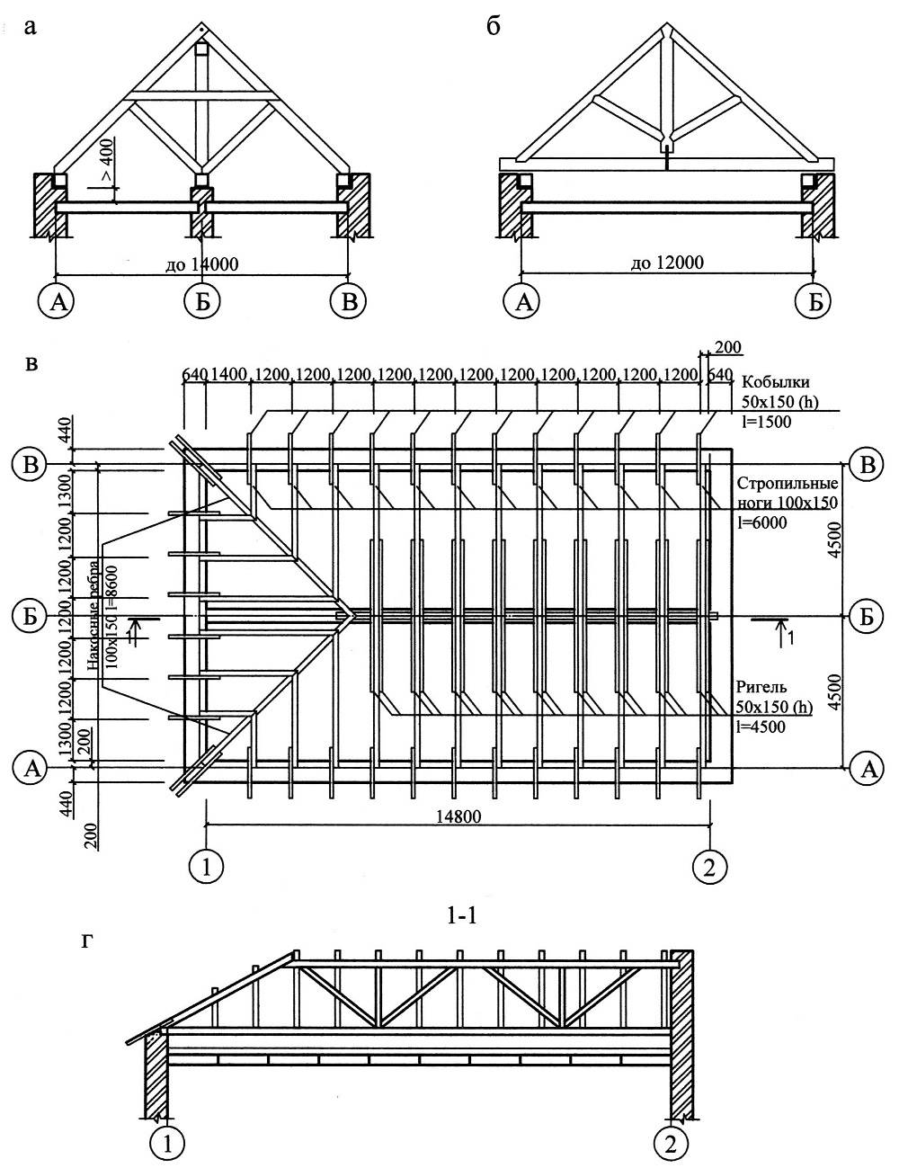 Виды стропильных систем с висячими стропилами для разных пролетов между несущими стенами