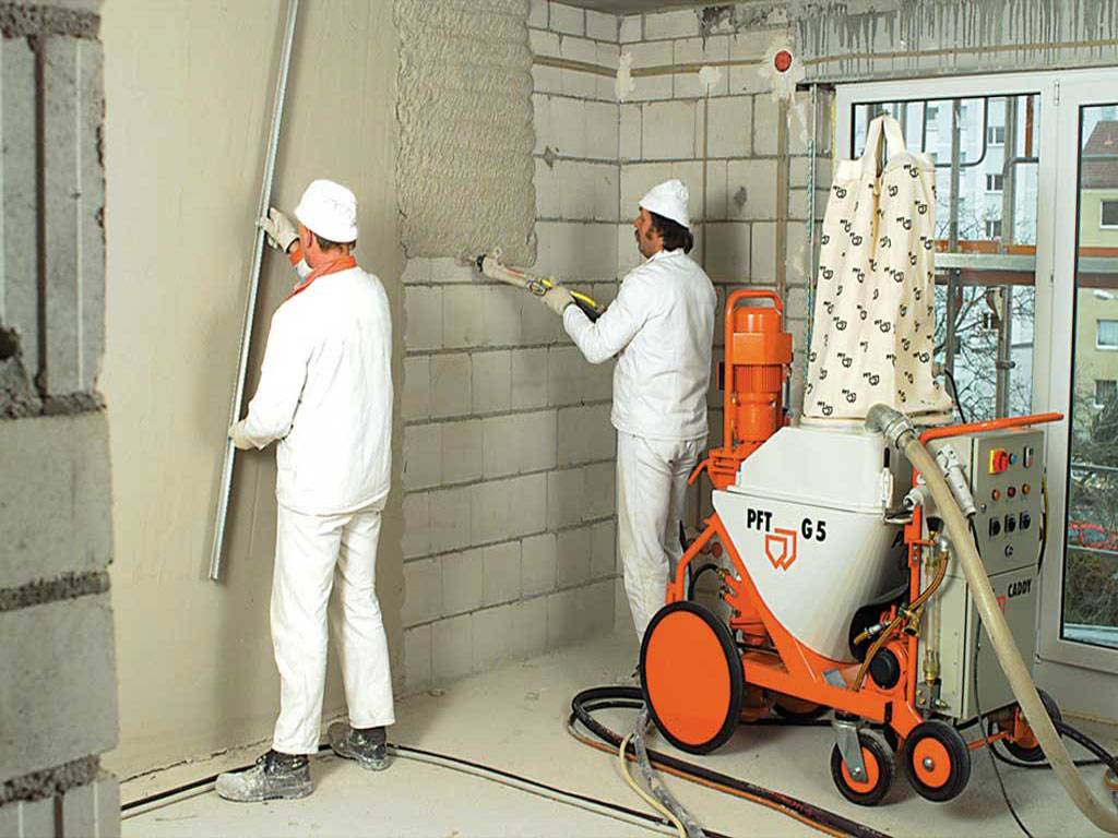 Таким образом, механизированную штукатурку могут выполнять 1−2 сотрудника, а скорость работы возрастает в 4−5 раз по сравнению с ручным режимом труда.