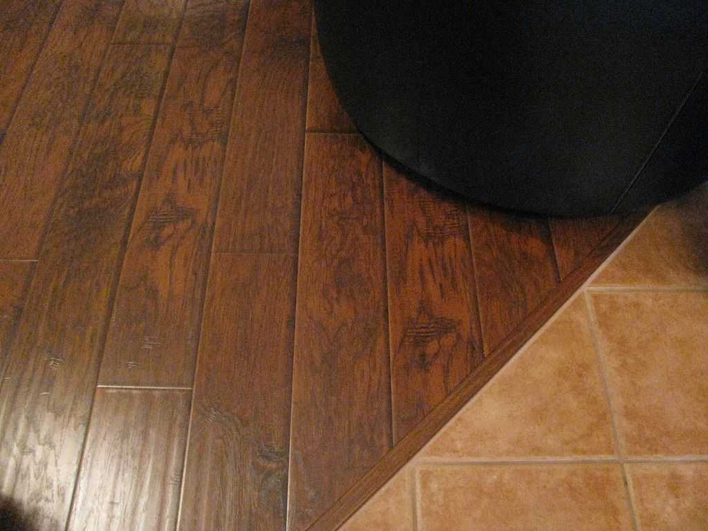 При этом будет образован стык плитки и ламината без явной границы Еще раз необходимо акцентировать внимание на одинаковом уровне. В процессе монтажа допускается использовать различные виды грунтовки для образования единого рисунка Единственным условием является безопасность эксплуатации для деревянных ламелей