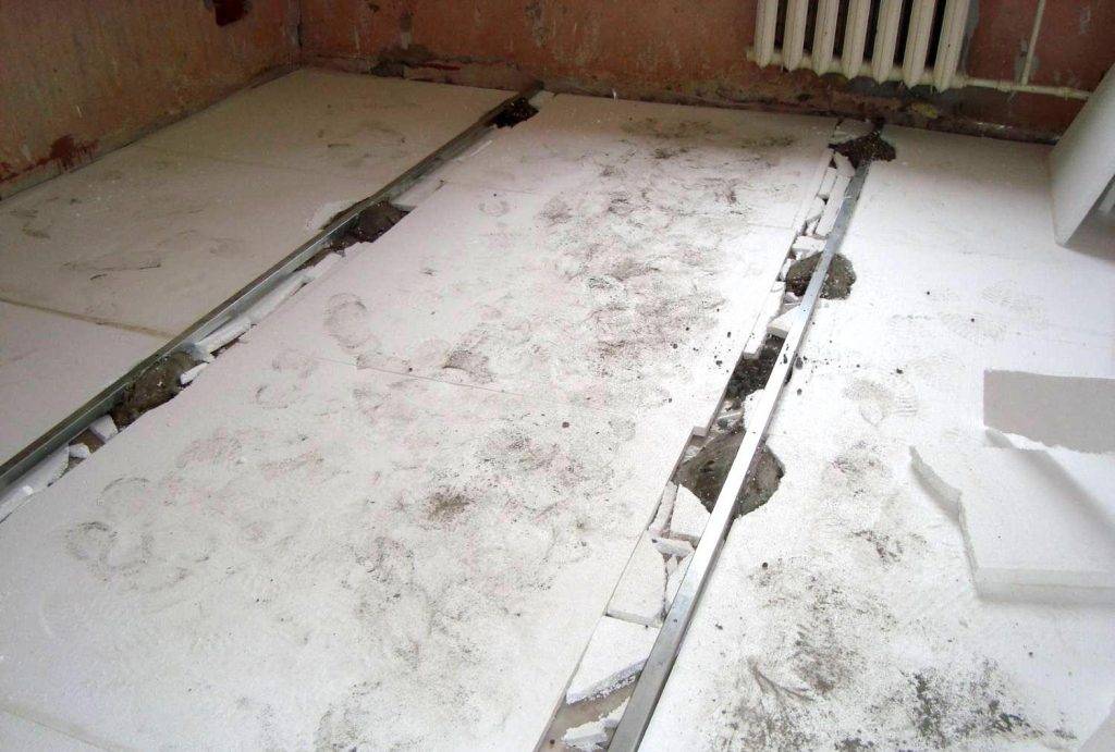 Если основание достаточно ровное, на данном этапе укладывают термоизоляционные плиты из ЭПП (экструдированный пенополистирол) или минвату большой плотности. Таким образом, с одной стороны, окончательно выравнивается уровень по горизонтали, а с другой – обеспечивается необходимая звуко- и термоизоляция.