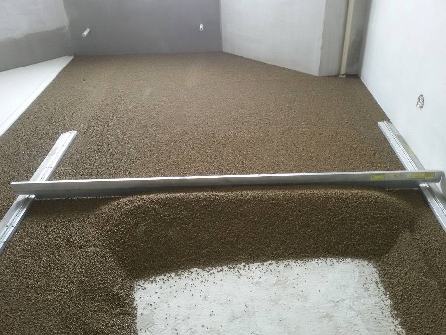 - На полу формируют кучки керамзита нужной высоты. На них выкладывают профили-маяки, между маяками насыпают керамзит, прави́ло опирают на профиль и выравнивают им засыпку.