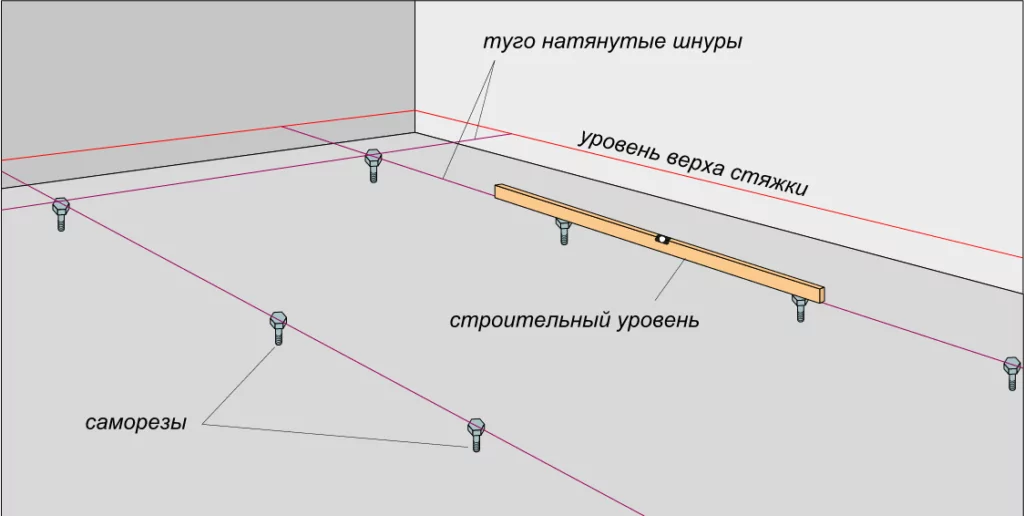 - Аналогичные действия провести со всеми промежуточными саморезами либо поступить проще: натянуть между крайними крепежами достаточно тонкую и прочную нить, и, ориентируясь на её уровень, вкрутить через 20 см в пол саморезы.