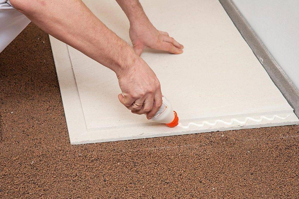 Начинайте засыпку с дальнего угла комнаты. Тогда вам не придется выравнивать слои, балансируя на уже уложенных листах ГВЛ. Выставьте маячки и насыпьте столько керамзита, чтобы его хватило на размер 2-3 листов ГВЛ. Разровняйте засыпку, положите листы и промажьте ламели и стыки клеем.