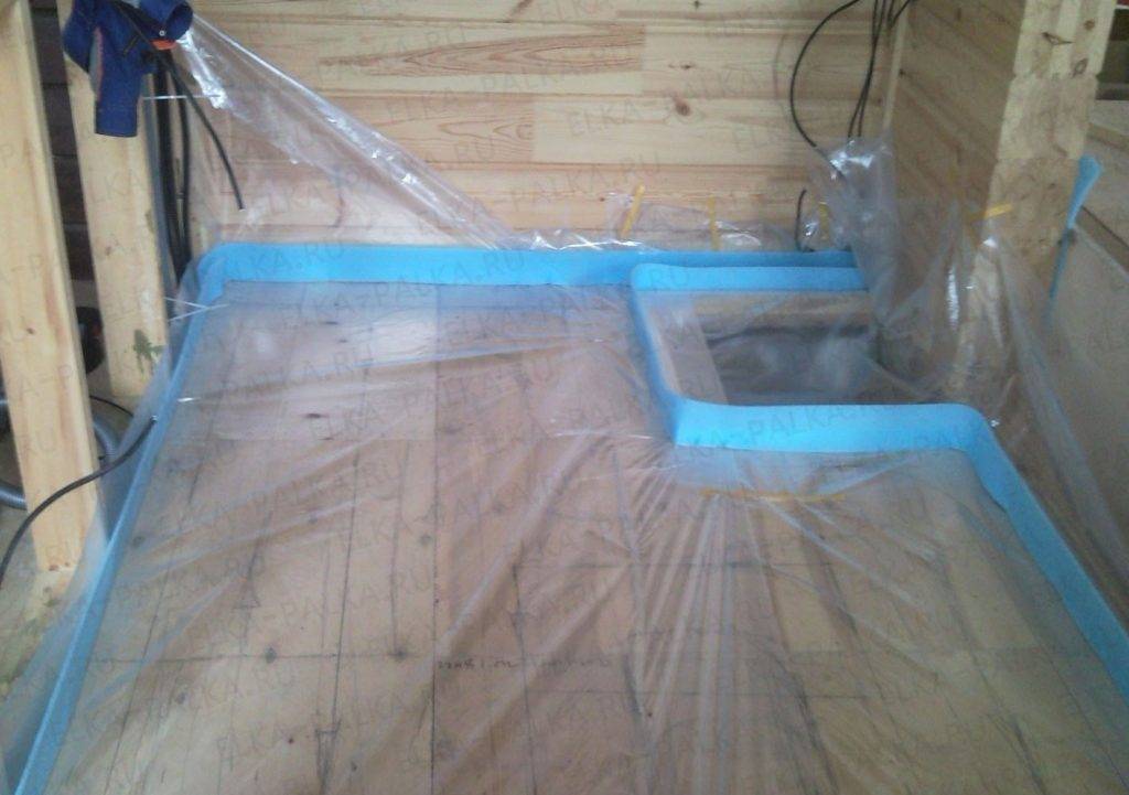 По поверхности подготовленного основания настилается слой гидроизоляции. Для этих целей может быть использована полиэтиленовая пленка или другой материал, обладающий водонепроницаемостью.