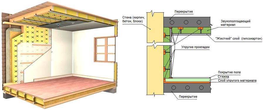 Принципы обустройства звукоизоляции зависят от особенностей выбранного материала – его помещают в каркас из профиля или наклеивают непосредственно на поверхность конструкций.