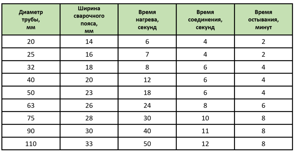 Длительность нагрева зависит не только от диаметра изделий, но и от глубины сварки (об этом можно узнать из приведенной ниже таблицы).