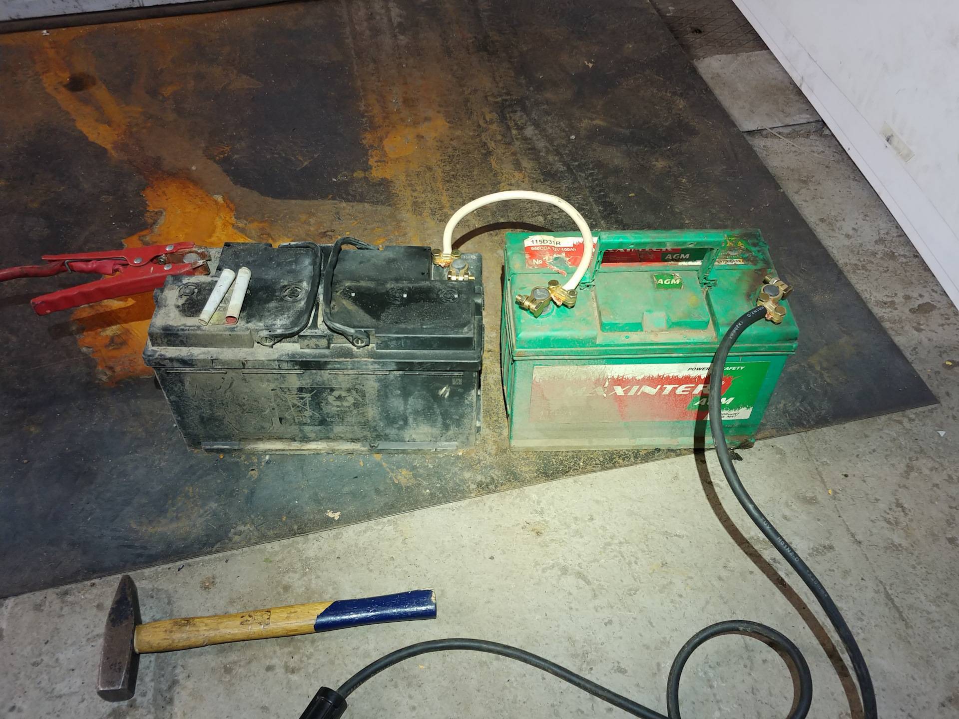 - Провода для «прикуривания» от аккумулятора или любые другие толстые медные провода в изоляции сечением от 16 мм + несколько зажимов-крокодилов. Провода лучше использовать покороче, так как с ростом длины, будет расти и их сопротивление, и мощности одного автомобильного аккумулятора может не хватить на то, чтобы его преодолеть.