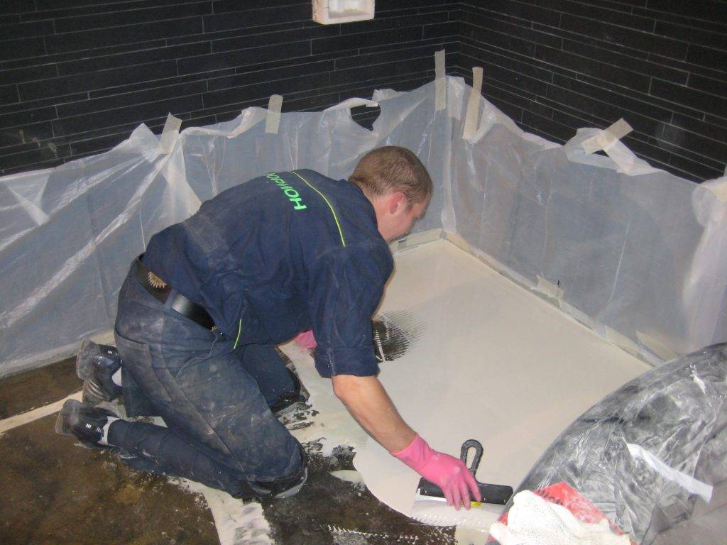 Грунтовка поверхности для повышенной адгезии. Нанесение и разравнивание раствора при помощи шпателя