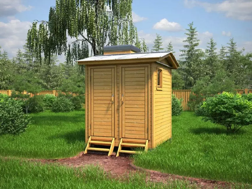 Конструкция работает по предельно простому принципу. Непосредственно туалет обустраивается рядом с домиком. Унитаз размещают внутри помещения, а выгреб – за его пределами.