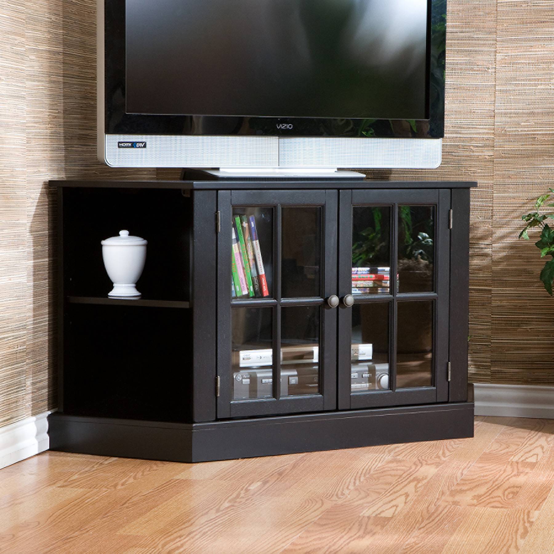 - Угловая — один из функциональных вариантов для небольших квартир или тех комнат, где телевизор не играет главенствующую роль, к примеру спален. За счет угловой конфигурации такой шкафчик занимает мало места, но при этом его полки или ящики обладают достаточным объемом и могут использоваться, к примеру, вместо комода для белья или книжной этажерки. А внешний вид угловых тумбочек и полок всегда придает помещению дополнительный уют.