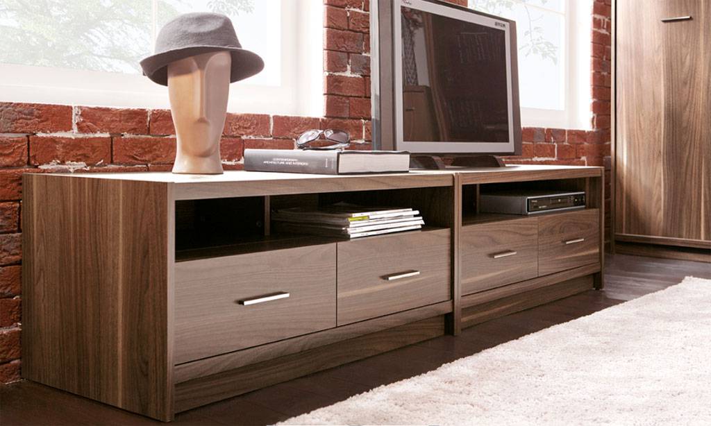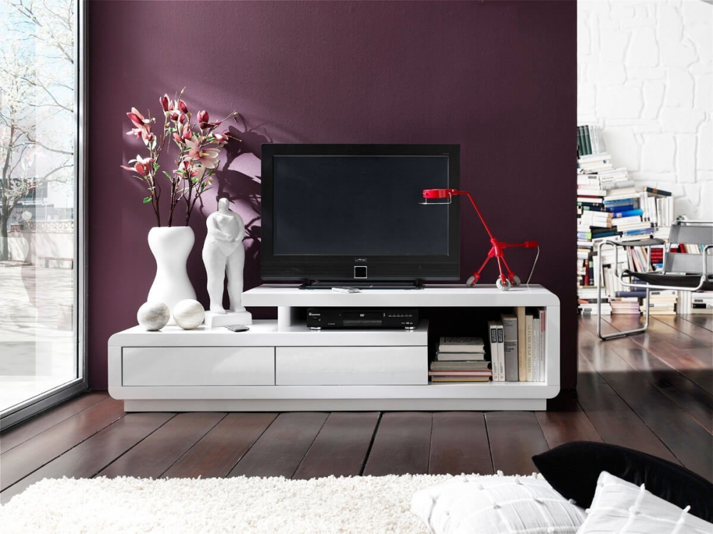 Монтаж к одной из стен — самый популярный способ размещения тумбы. Он универсален для помещений любого размера. Последний тип установки длинной ТВ-подставки целесообразен для скошенных углов. Можно также купить угловой комод , который точно впишется в интерьер и позволит использовать дополнительное место для хранения. Отличается небольшими размерами.