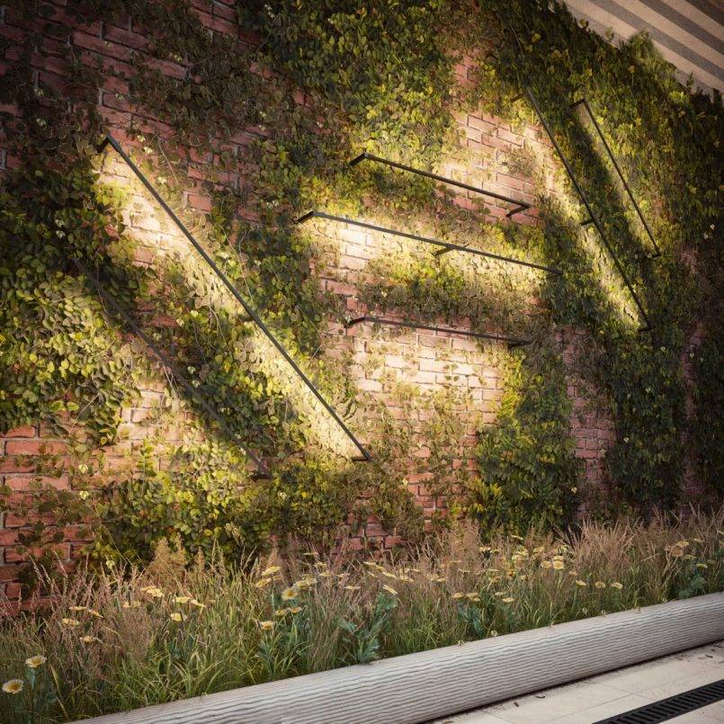 - Настенные — очень выгодно выделяют участок стены. Может применяться и как элемент подсветки придомовой зоны.