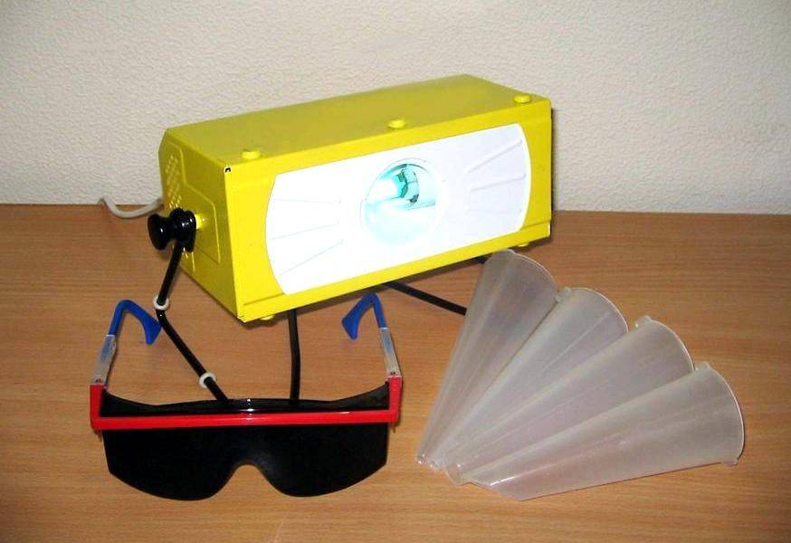 Весит прибор 1 кг, в комплекте с ним идут три тубуса для проведения процедур с участием разных участков тела, есть защитные очки и биодозиметр. Цена – около 5 500 рублей. По отзывам пользователей, действительно хорошо помогает в лечении насморка. Плюс ко всему, прибор можно использовать и для санитарной обработки дома.