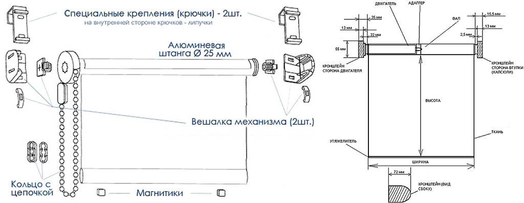Для самостоятельного монтажа рулонной шторы на окно чаще всего приобретают открытый механизм типа мини, слева на рис. Такие дешевле, продаются с полотнищами или без. Недостаток – полотнище пылится. Рольшторы мини выпускаются только для окон с прямым штапиком выше 14 мм. Устройство рольштор-мини под установку без сверления показано слева на рис. ниже. Выпускаются они и электрифицированными, там же справа. Адаптер в данном случае – волновой или циклоидный редуктор, так что с повторением своими силами проблем масса и очень умелым.