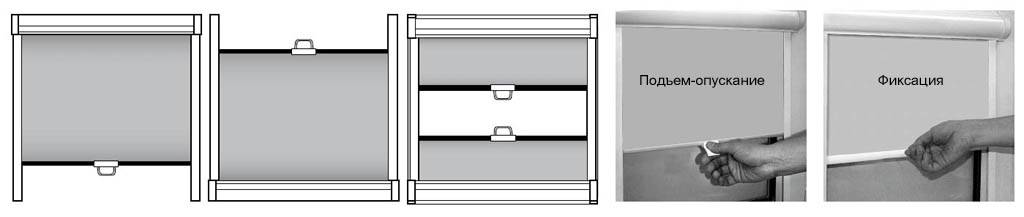 По принципу управления различаются рулонные шторы ручного и автоматического действия. Ручное управление может осуществляться несколькими способами.