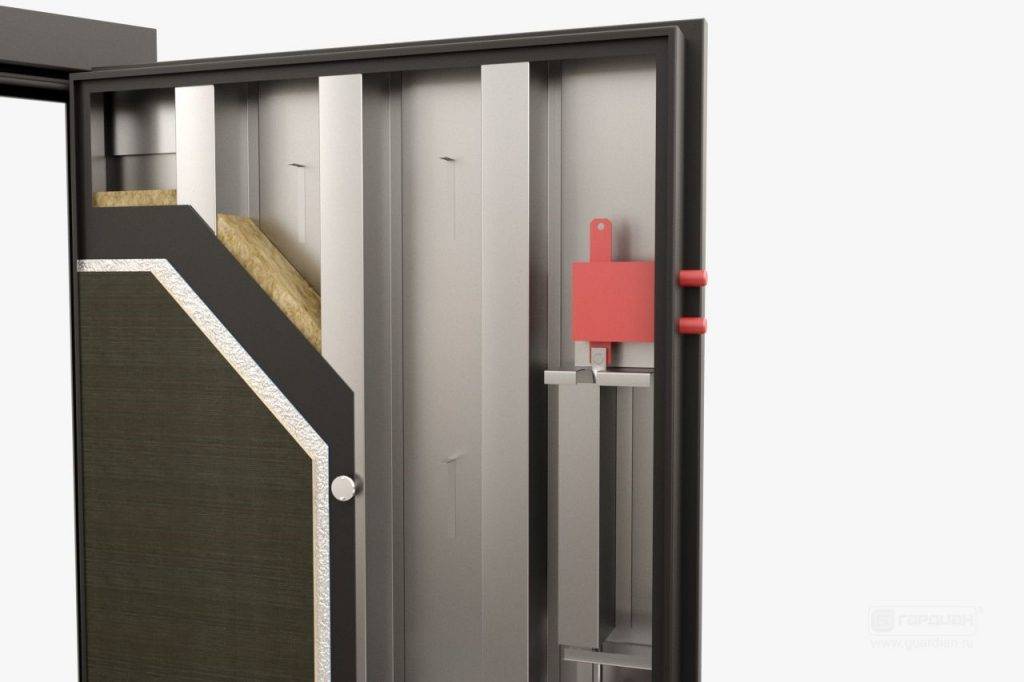 Вторым важным параметром, обеспечивающим геометрическую неизменяемость и взломостойкость является количество и расположение рёбер жёсткости – дополнительных стержневых стальных деталей, которые привариваются внутри рамы каркаса. Существует 3 основных типа дверных полотен по критерию расположения данных элементов:
