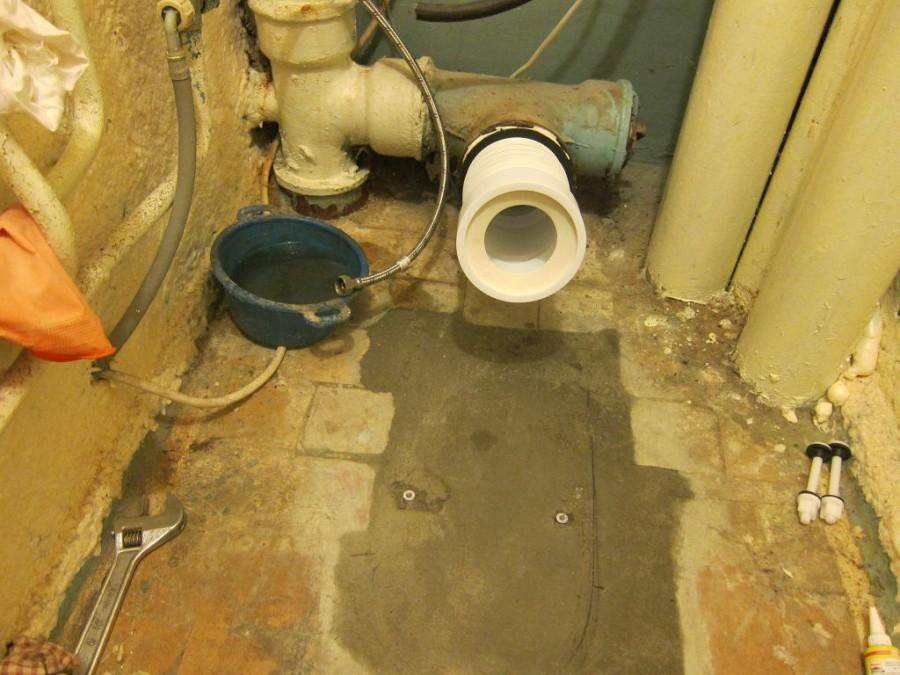 Перед установкой нового унитаза старую сантехнику демонтируем, пол под ним зачищаем, ремонтируем и заполняем полусухим цементным раствором