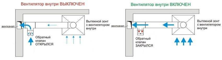 Такая схема установки вытяжки препятствует возникновению обратной тяги и осуществлению естественной вентиляции, когда вытяжное оборудование выключено.
