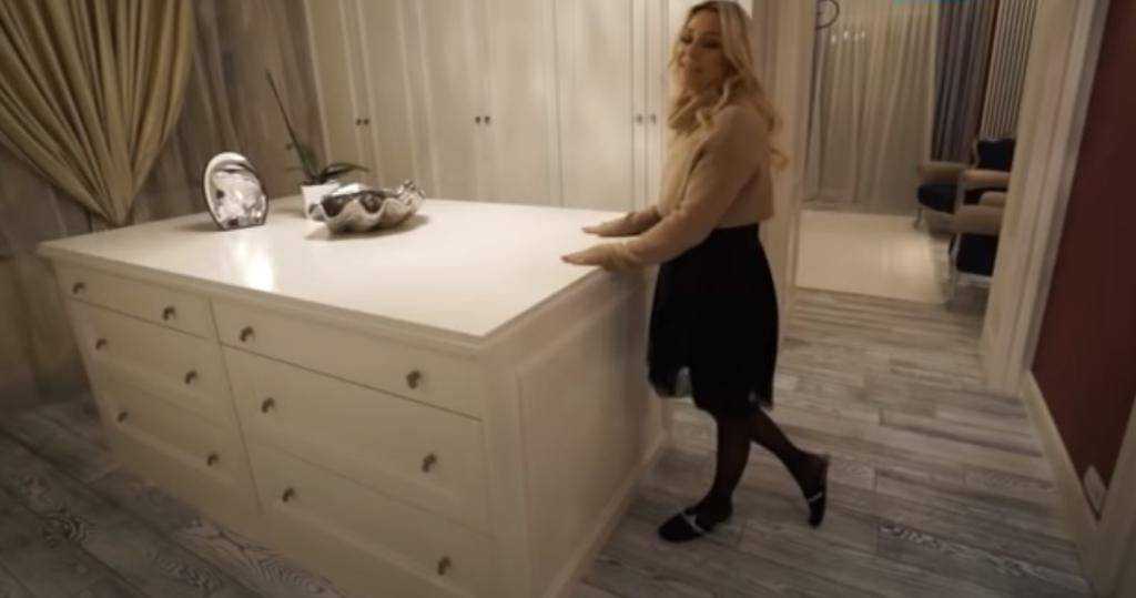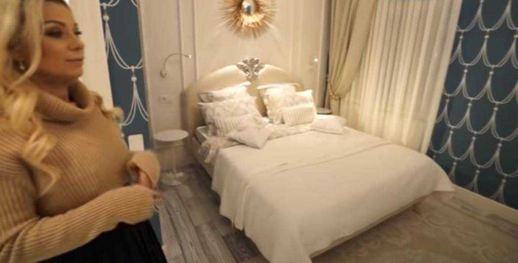 На ремонт было потрачено больше 1-го года. Его выполняли в нескольких спальных помещениях, гардеробе и ванной комнате. Все перегородки убрали. Что же до новой мебели, то её изготовление заказали у итальянских рабочих. Все стены сделали полностью белыми. Что же до кровати, то в ней преобладают серые и синие цвета. Особого внимания стоит изголовье на кровати.