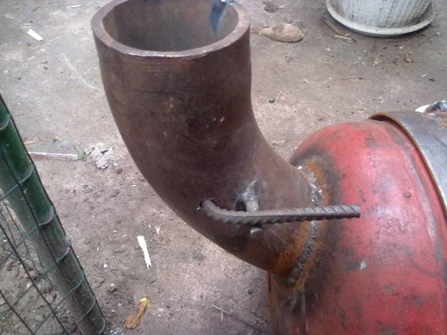 На месте крупного отверстия, где был удален вентиль, монтируем трубу-дымоход и привариваем.