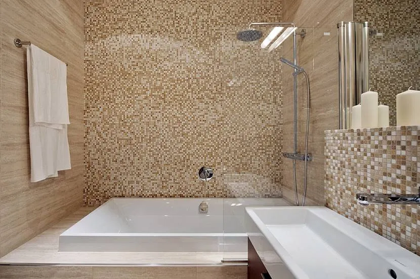 - Вместо душевой кабины со стенками лучше повесить занавеску и вместо поддона создать нишу в полу. Или наоборот вместо поддона сделать выступ из кирпича, плитки или мозаики;