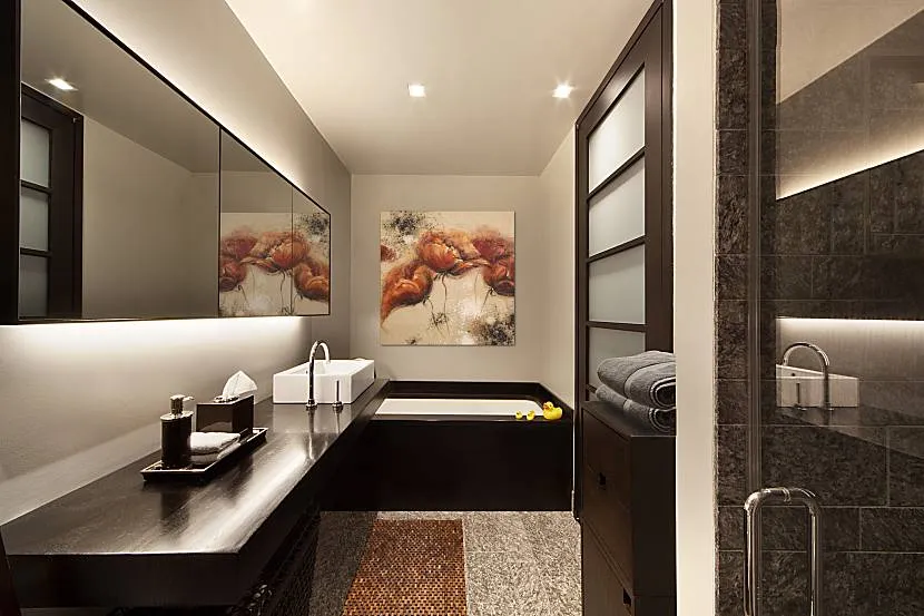 Интерьеры ванных комнат в современном стиле очень требовательны к освещению. Как правило, имеется несколько световых сценариев, которые задействуются в различных ситуациях. Помимо общего света, за который, как правило, отвечают точечные потолочные светильники, в ванных комнатах используют подсветку зеркал, отдельно висящие бра, подвесы в зонах умывания, а также фальш-окна.