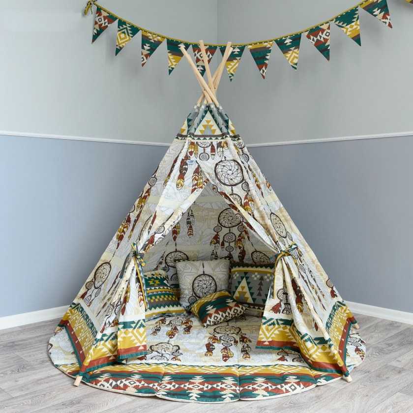 Незаурядный и забавный способ украшения вигвама, который понравится и детям, и взрослым, — ловец снов. Его можно купить либо сделать своими руками в стилистике шалаша. Можно использовать несколько штук, на рисовать его на ткани, купить декоративные подушки с изображением символа. Такой вариант подойдёт и для детей постарше.