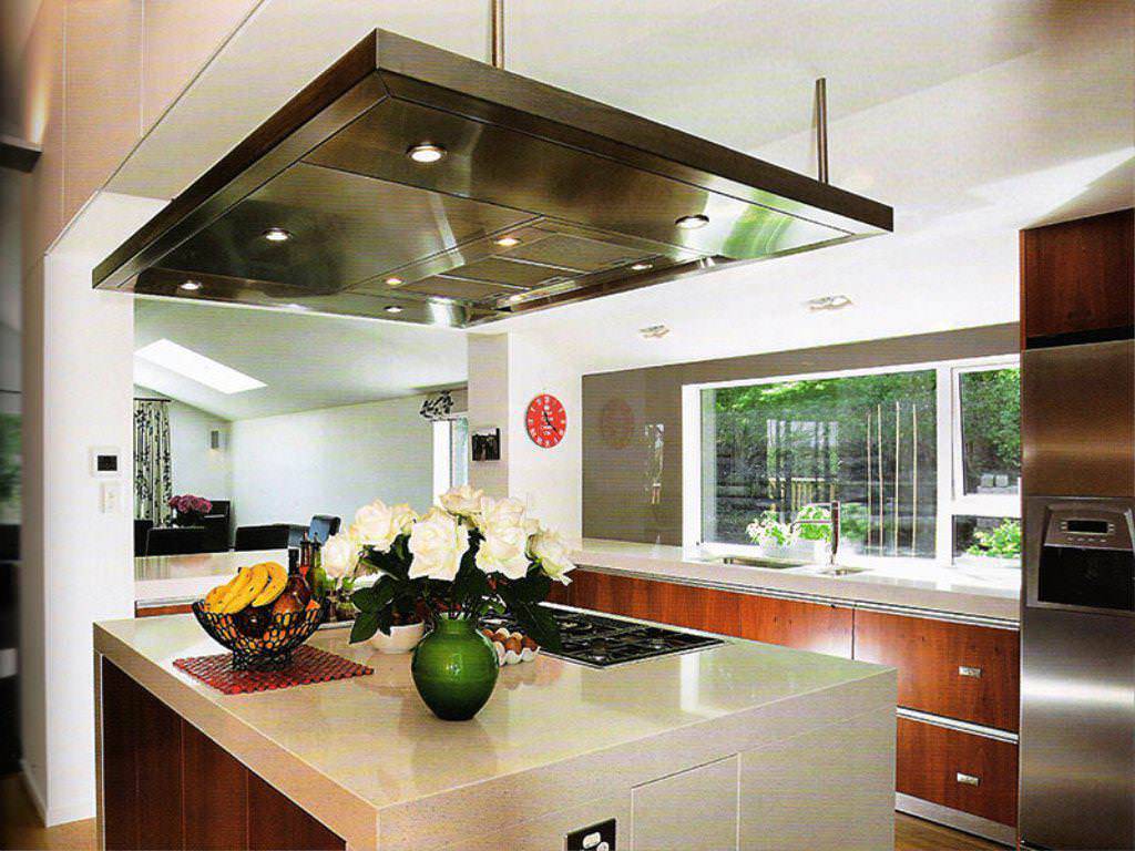 Потолочные вытяжки предназначены для кухонь с печкой, установленной посреди помещения. Такие устройства встречаются в основном в престижных жилищах с повышенными условиями комфорта. Монтаж островных моделей осуществляется работниками специализированных фирм.