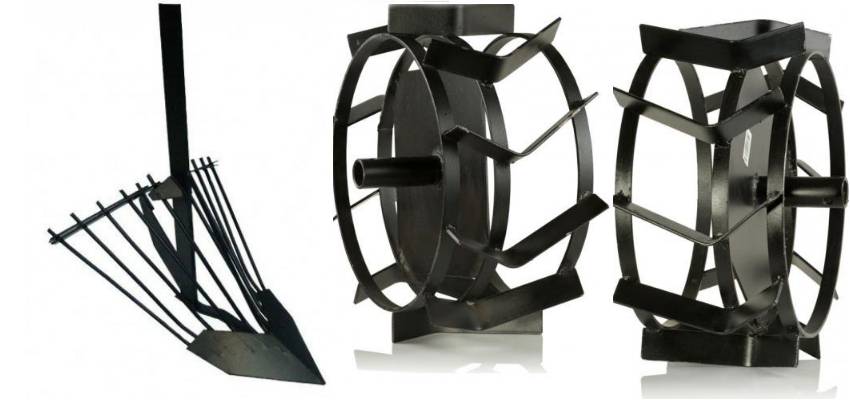 Это одно из самых востребованных оборудований для мотоблоков. Такие специальные устройства представляют собой обычные металлические колеса, дополненные шипованными накладками. Без грунтозацепов невозможно сцепление культиватора с почвой, а значит, и движение по земле. Они выполняют и ряд других важных функций: