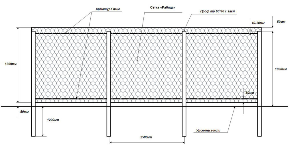Отличается легкостью монтажа и невысокой стоимостью. Один край рабицы фиксируется к столбу, другой ‒ плотно натягивается. Рекомендуемое расстояние между опорами ‒ не более 2,5 м.